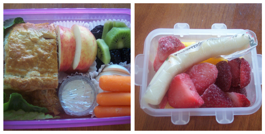 Leftover meat pie, apple slices, fresh kiwi & blackberries, sliced mushroom, baby carrots & dip. Frozen sliced strawberries & mango pieces, cheese stick.